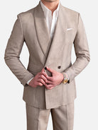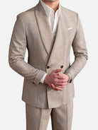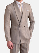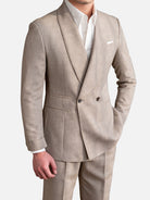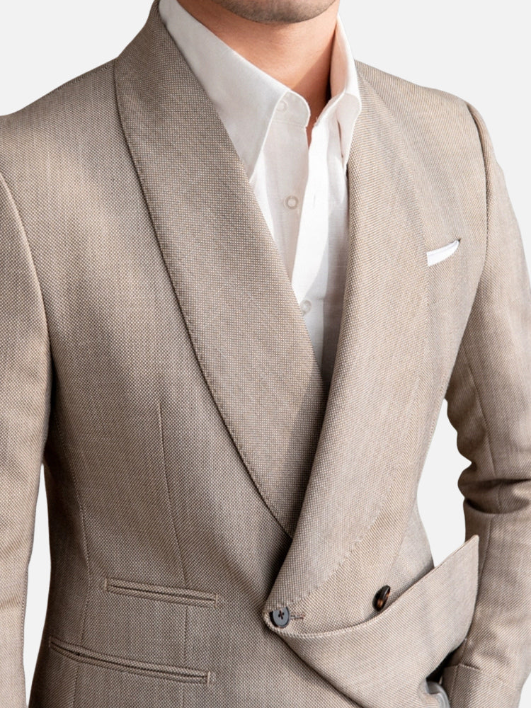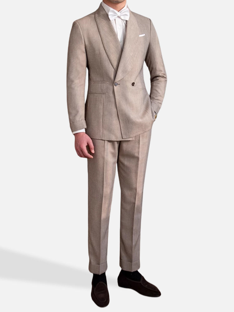 クラシックなピークドラペルに、ワイドショルダーとウエストシェイプを効かせたスリムシルエットで、優雅かつ端正なプロポーションを演出します。適度なラペル幅が紳士的な印象を添えつつ、堅くなりすぎないバランスに仕上げています。