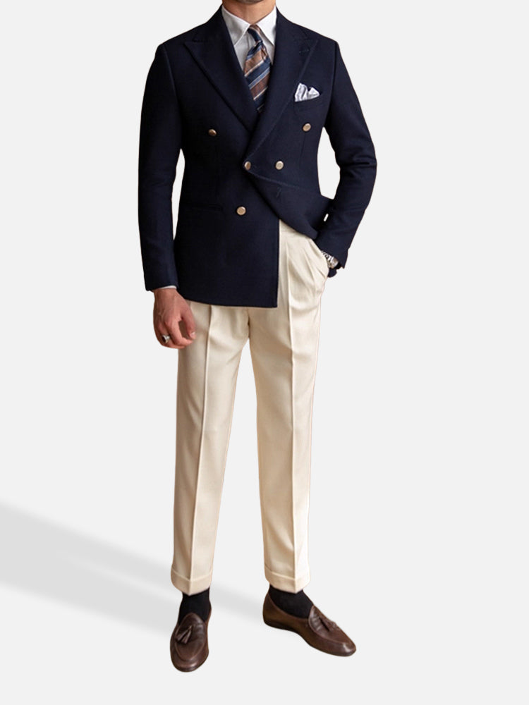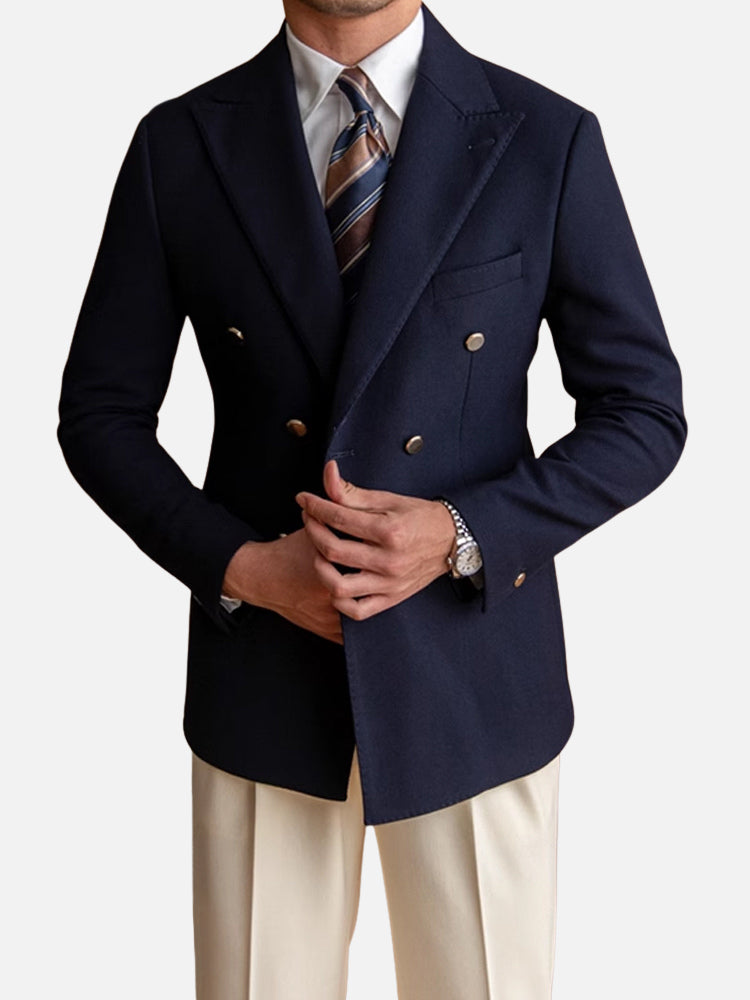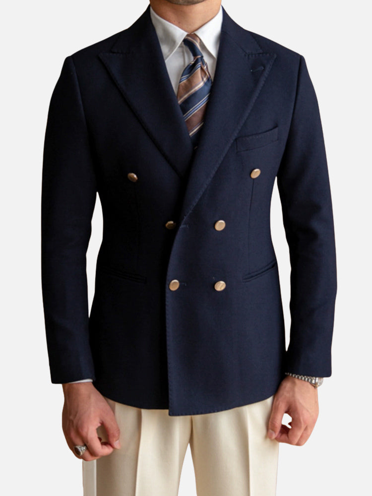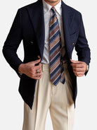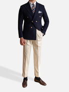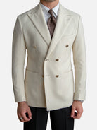 ダブルブレストのノッチドラペルデザインは、イギリス紳士の気品とライトラグジュアリーな雰囲気を融合。広めの肩幅が自然に垂れ、シャープな肩ラインを作り出し、着心地も快適で動きやすい。内側は全てパイピング仕上げで、細部まで丁寧に仕上げられ、全体の仕立てが引き立ちます。