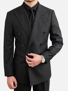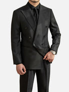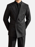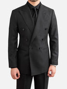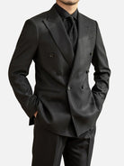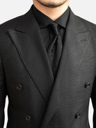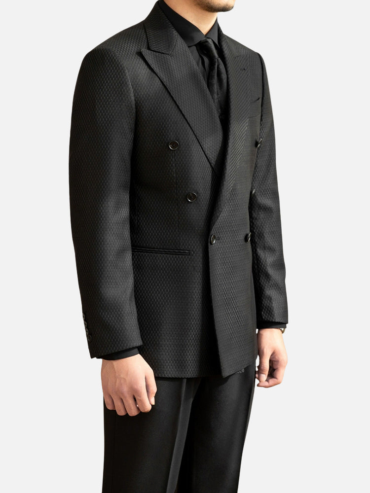 黒のチェック柄スーツジャケットは、ナポリ仕立てのクラシックなシルエットを踏襲し、ノッチドラペルと6ボタンでシャープな印象に。丸みのある肩と裾が自然なラインを描き、サテンプリントシルクの裏地がさりげない上質感を添えます。
