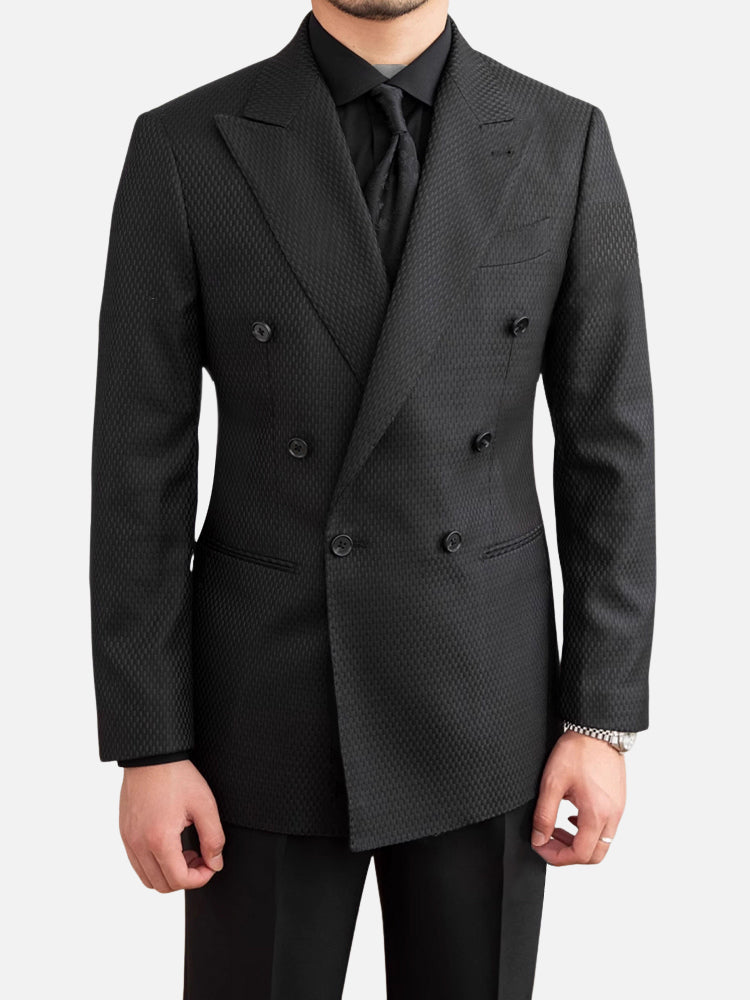 ウール混紡のテクスチャードチェック柄生地は、細やかな手触りとハリ感を持ち、微光沢が黒の落ち着きと視覚的な張りを引き立てます。