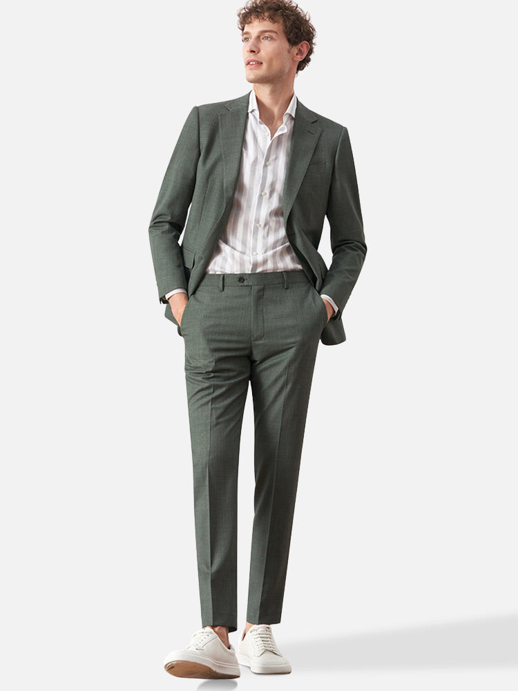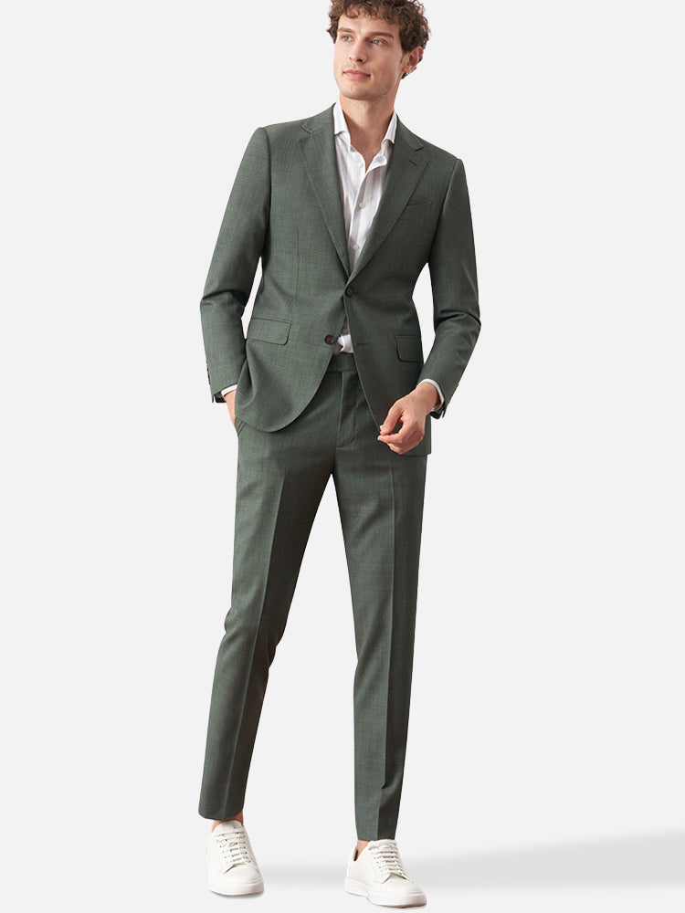 落ち着いたグレーグリーンが上品な印象を演出。柔らかく滑らかな肌触りで型崩れしにくく、通気性や防シワ性にも優れた素材です。