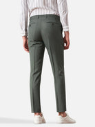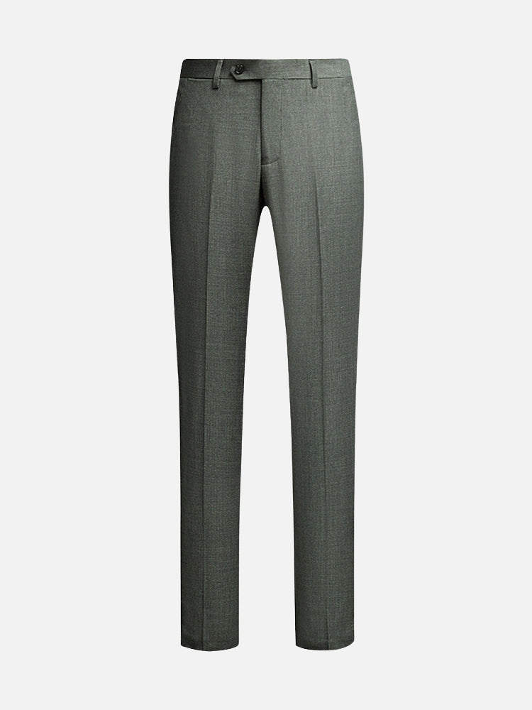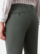 淡いグリーングレーのスリムスラックス。ジャケットで品よく、カーディガンやデニムと合わせれば軽やかに。ローファーや革靴にも馴染む、汎用性の高い一本です。