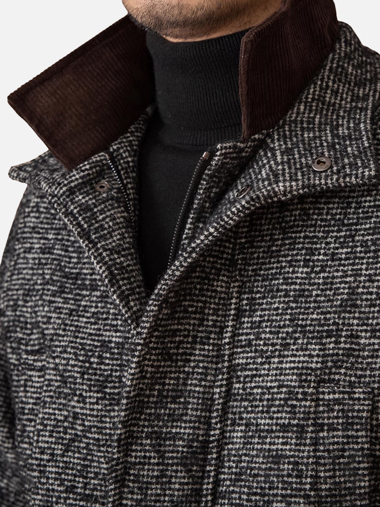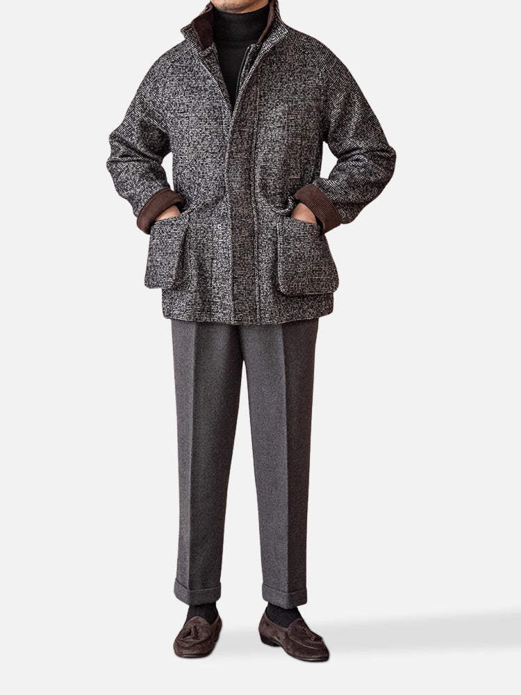 スタンドカラーが顔まわりをすっきり見せ、全体にシャープな印象をプラス。ほどよい厚みの生地は保温性と快適さを兼ね備え、袖口のコーデュロイ切り替えがさりげないアクセントに。シンプルなポケットも実用的で、秋冬の通勤や日常使いに最適な一着です。