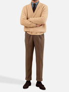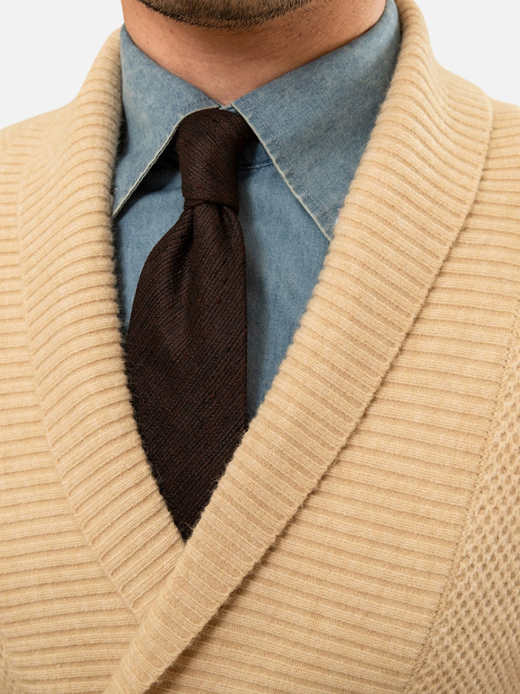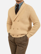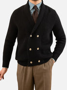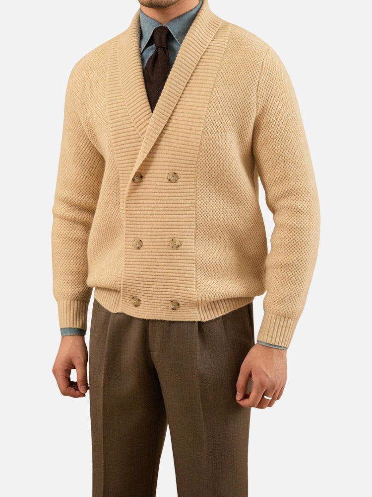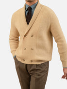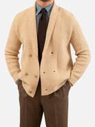ヴィンテージな英国風を踏襲し、クラシックなスタンドカラーにダブルブレストを組み合わせたシンプルで上品な紳士スタイル。浅めのブラウンボタンがアクセントとなり、柔らかなレイヤード感を演出。ニットジャケットとして単品着用はもちろん、スーツやコートのインナーとしても自然に馴染み、優雅さと実用性を両立します。