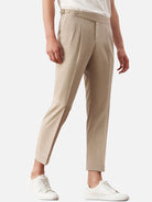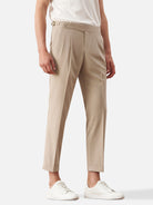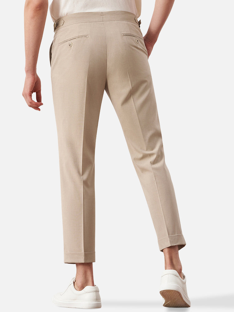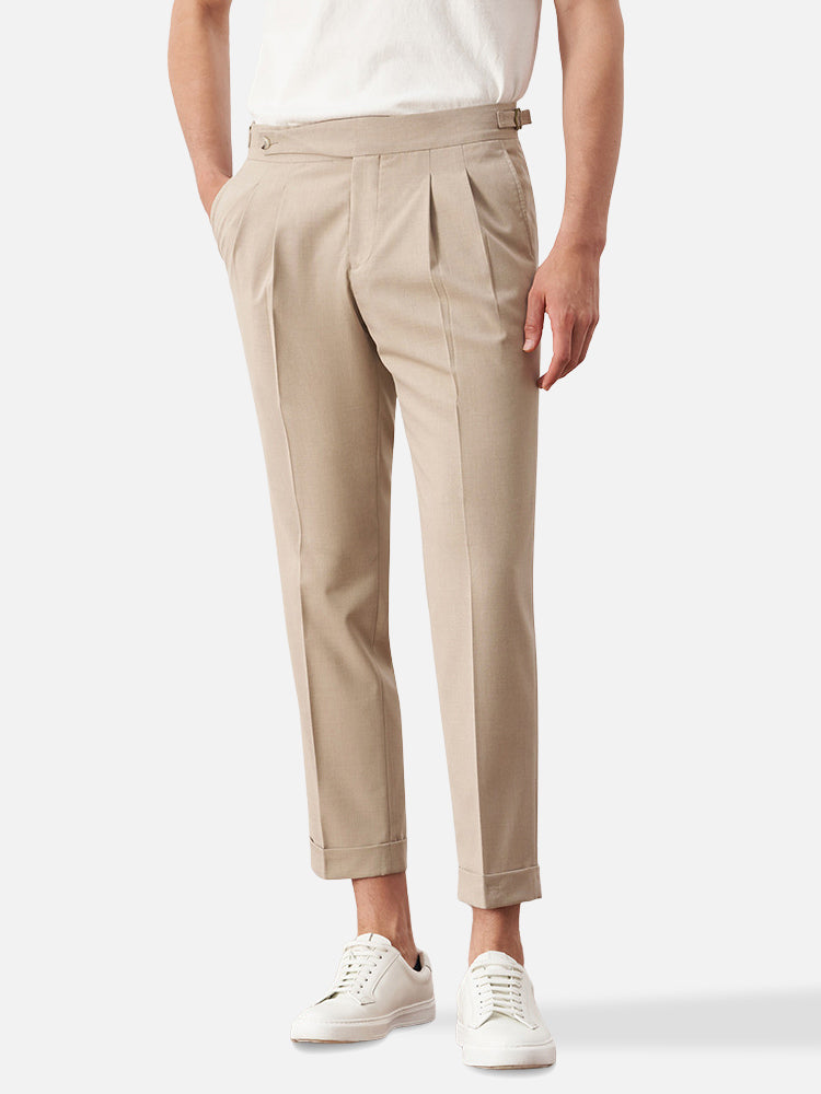ベージュのクロップドスラックスは白シャツやダークポロで都会的に。春秋はネイビージャケットやトレンチで落ち着いた印象に。