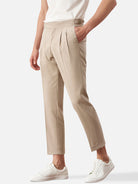 わずかにテーパードしたレッグラインで脚をすっきり見せるスリムクロップドパンツ。ウエストのVスリットとパリスフック、後ろウエストのベントにより、ベルトなしでも快適にフィット。後ろポケットは一体成型で縫製も丁寧、裾はフラットに仕上げて美しいラインと自然なドレープを演出します。