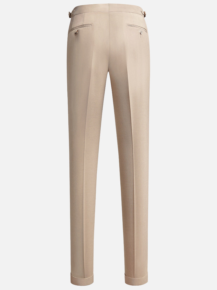 柔らかなベージュのテクスチャー生地で、通気性と自然なドレープを備えています。適度なハリがあり、シワになりにくくアイロンなしでも整った印象を保てます。