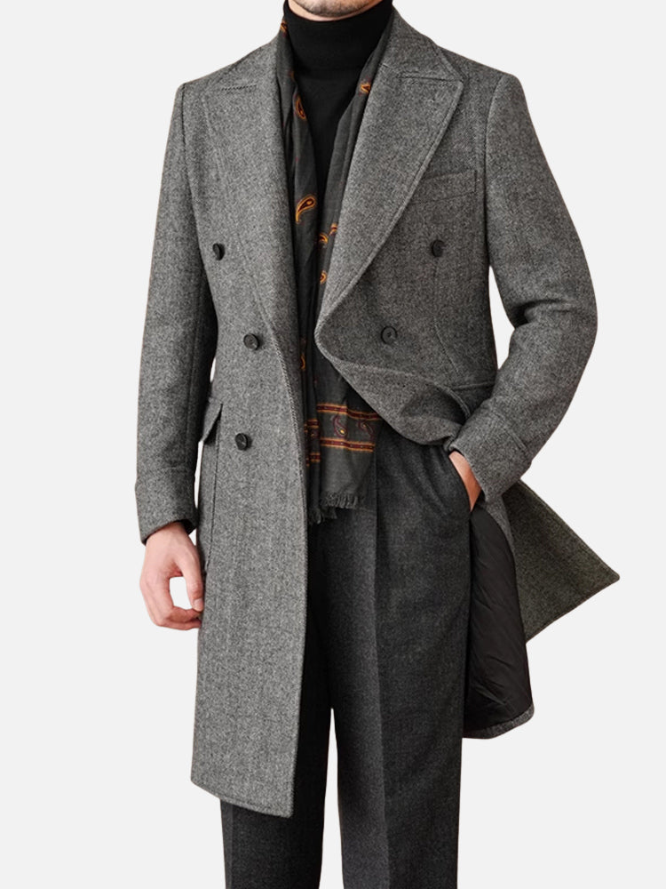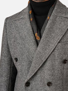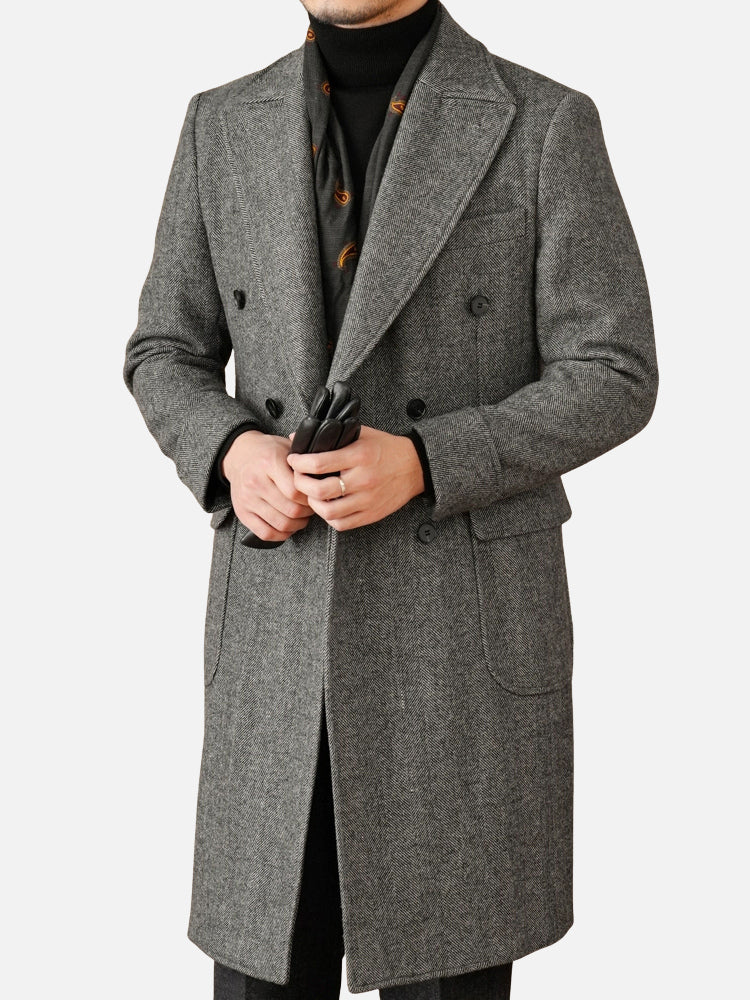 ポロコートのシルエットにヘリンボーン生地を合わせた一着。ミドル丈がスタイルを引き締め、ノッチドラペルが紳士的な雰囲気を演出します。大きめのパッチポケットで実用性とレイヤード感をプラスし、袖口の折り返しがさりげない上品さを添える、クラシックで新鮮なデザインです。