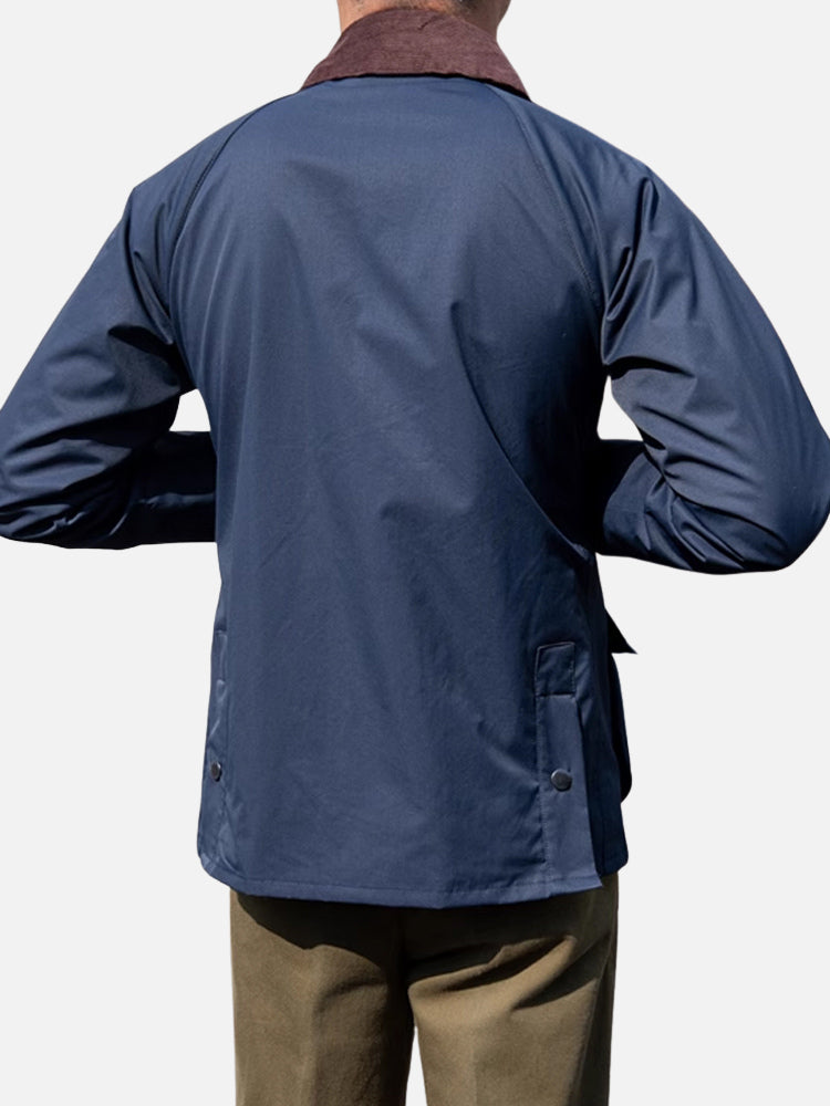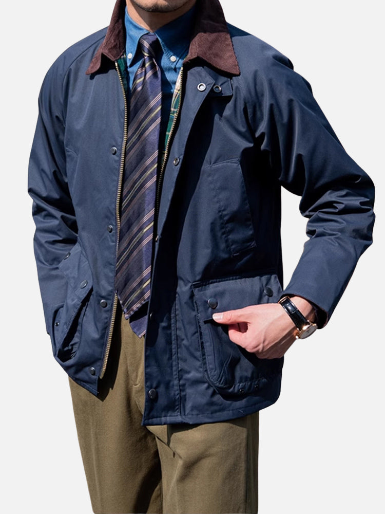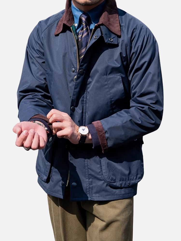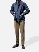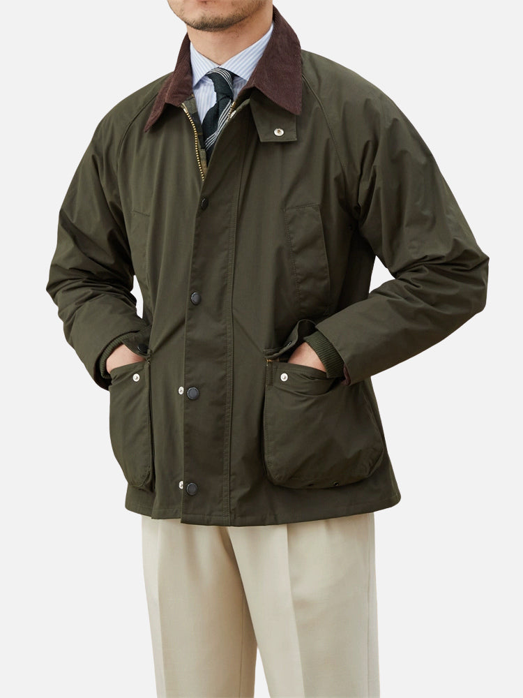 クラシックなモーターサイクルジャケットとハンティングジャケットの要素を融合し、現代的なシティスタイルに仕上げた一着。アジア体型に合わせたすっきりシルエットで、着丈や袖丈のバランスを整え、クラシックな表情と快適な着心地を両立しています。