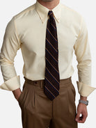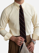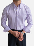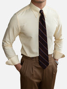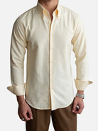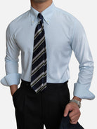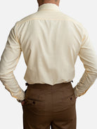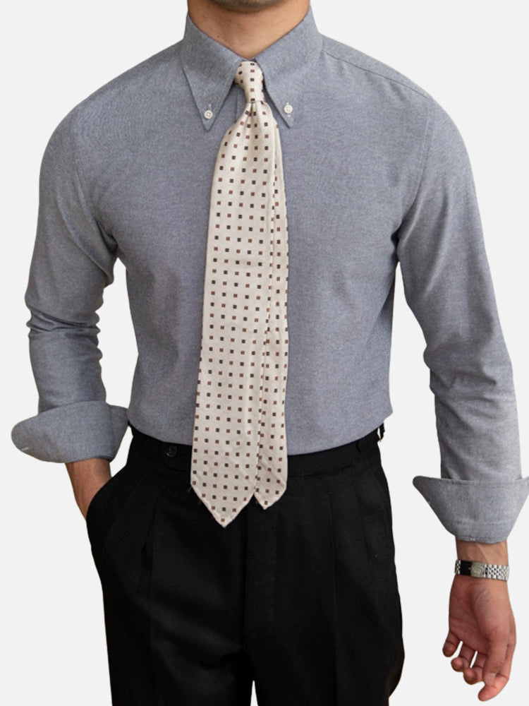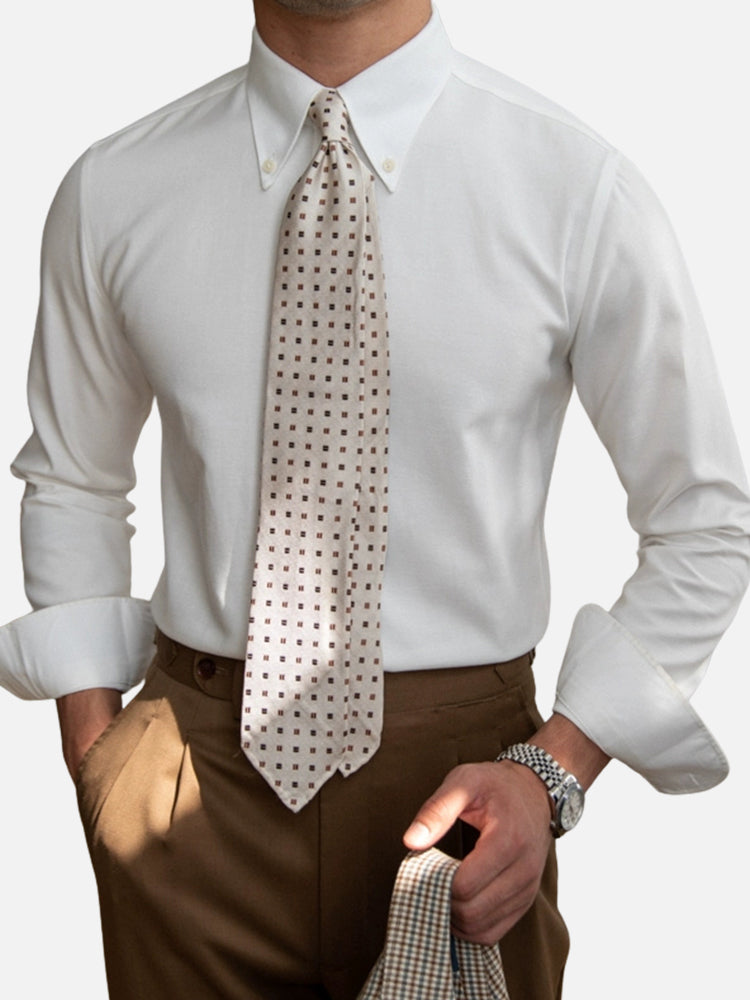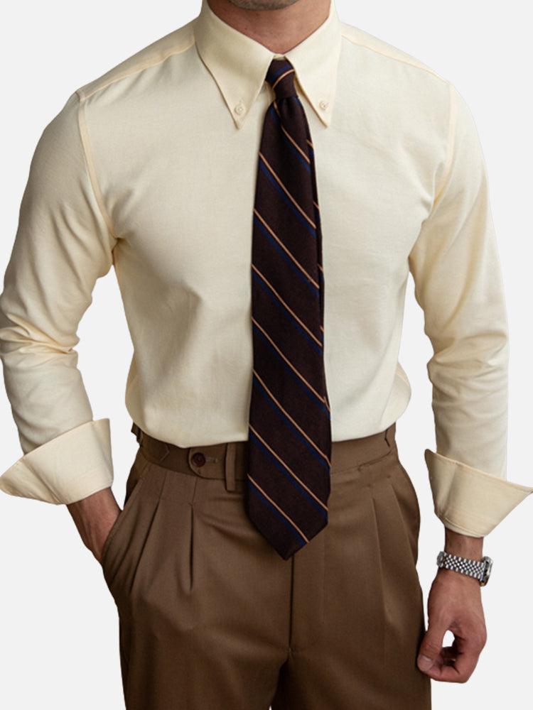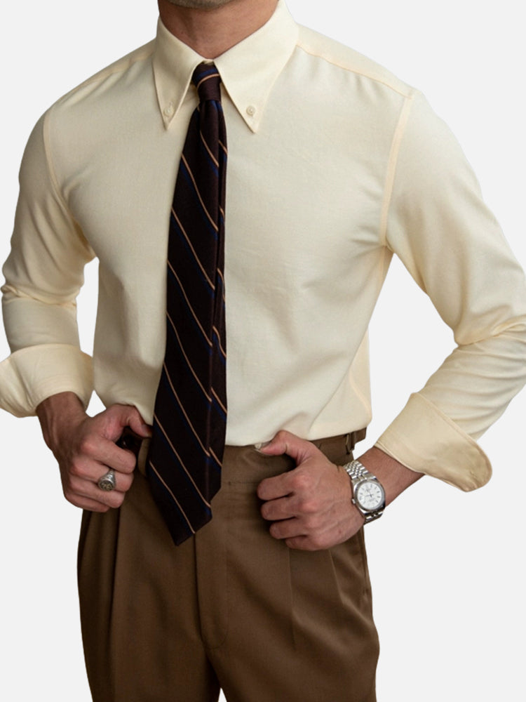 クラシックなフィットにシャープなカッティングを効かせ、通勤スタイルに最適。ボタン付きの尖った襟が実用性と落ち着きを添えます。ダブルステッチやインサイドステッチでハリ感を持たせ、前立て・袖口・襟元の複合布がシェイプ感を強調。長時間着ても型崩れしにくく、すっきりとした印象をキープします。