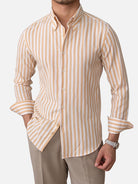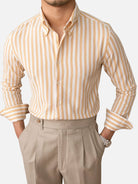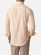 大ぶりのスプレッドカラーに隠しボタンを配し、シャープな印象にさりげないアクセントをプラス。ハリのあるストライプとシアサッカーの質感が奥行きのある清涼感を演出します。身体に沿いつつ程よくゆとりを持たせたシルエットで、快適さと上品さを両立。オンオフ問わず活躍します。