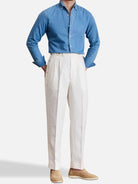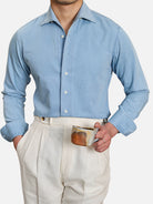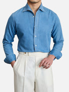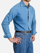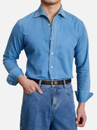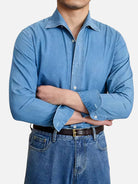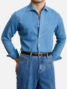 英国調の一枚襟デザインで、自然な折り返しがシンプルかつシャープな印象に。ストレートシルエットが体に程よくフィットし、一枚でも重ね着でも活躍します。デニムシャツらしい適度なハリとリラックス感を備え、四季を通じて楽しめるワードローブの定番です。