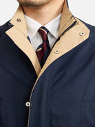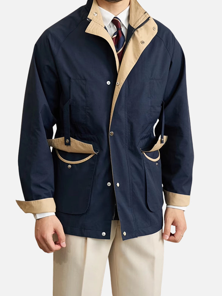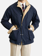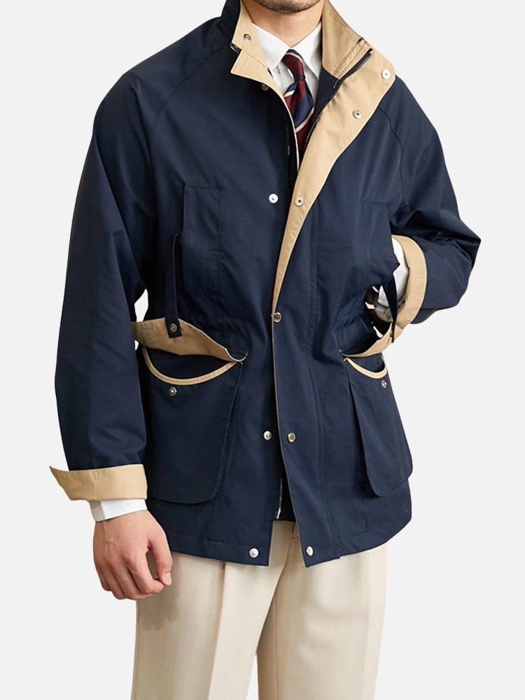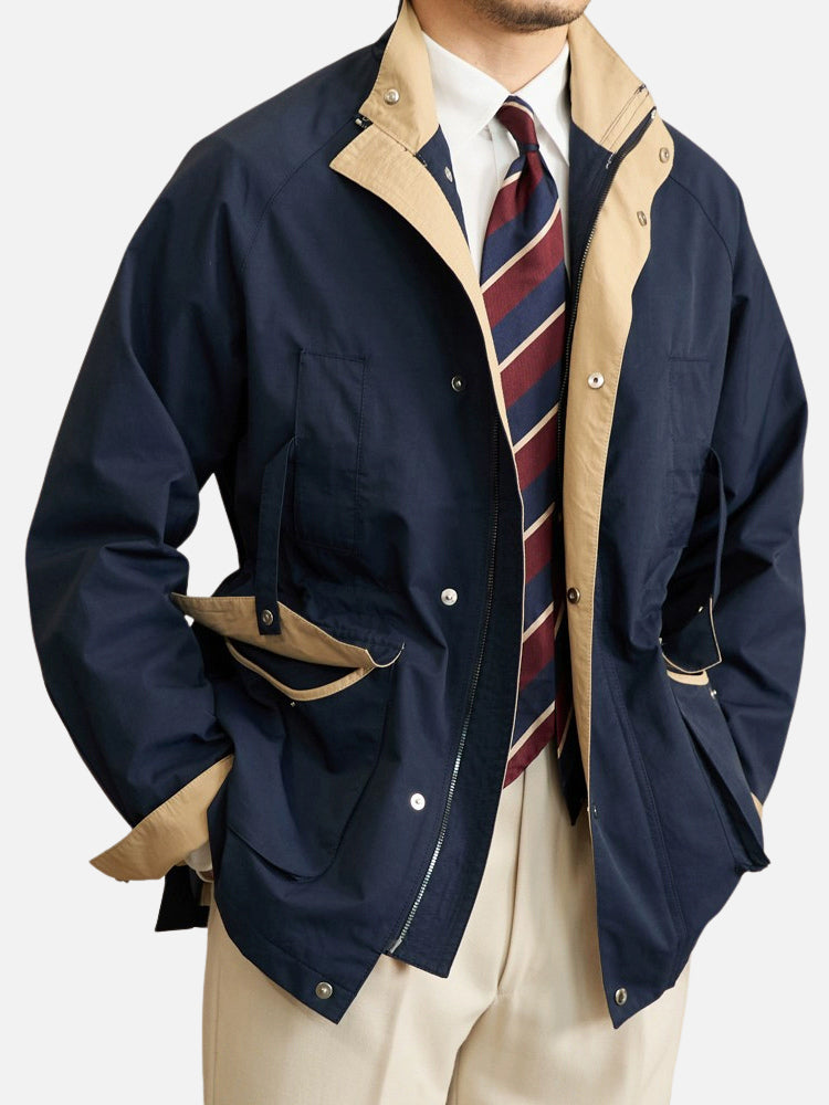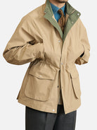 ウエストのドローコードでシルエットを調整でき、立ち襟とフロントファスナーで急な気温変化にも対応。コントラスト裏地がさりげないアクセントとなり、ゆったりとしたシルエットで快適な着心地です。