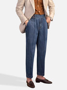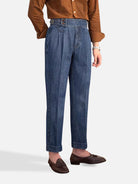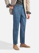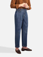 ストーンウォッシュ加工による味わい深い色落ちが、イタリアらしい上品さとラフさを演出。ハイウエストにヴィンテージ調のダブルボタンとロングタブを組み合わせ、腰位置を高く見せます。ダブルプリーツとミッドライズで動きやすく、腰まわりも快適にカバー。三枚仕立ての立体カッティングが脚のラインを整え、細身でも窮屈感のないはき心地です。
