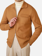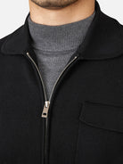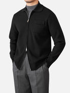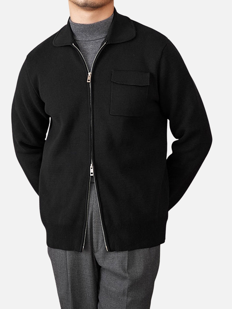 ニットの柔らかさにジャケットのシャープなシルエットを融合させた一着。ダブルジップで開閉を調整でき、デザインのアクセントにもなります。ハリのある襟が首元と肩のラインを整え、落ち着いた大人の雰囲気を引き立てます。
