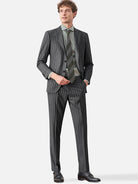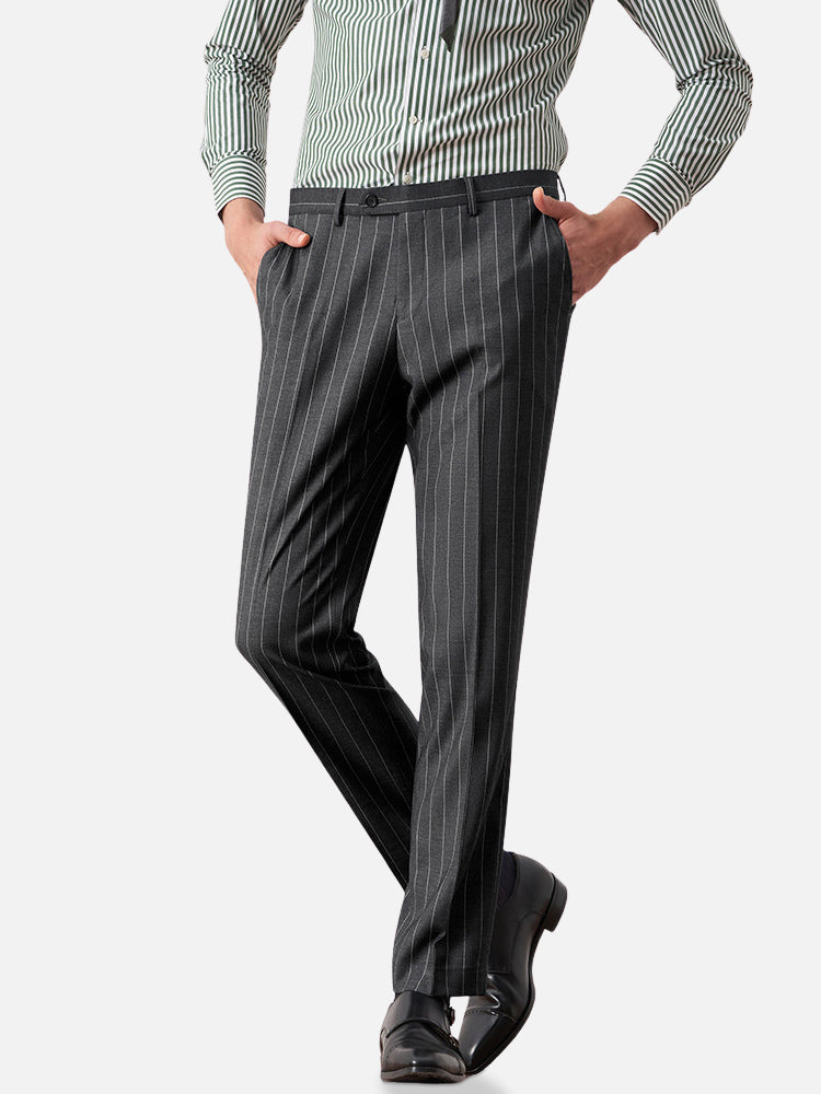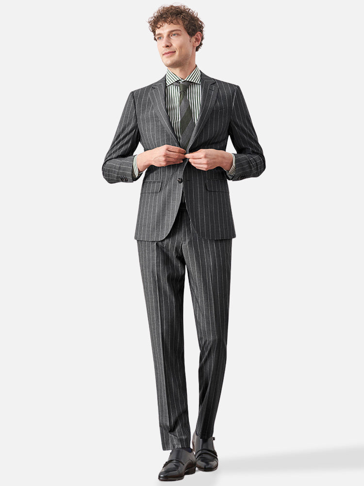 韓国版スリムフィットをベースに、グレーの縦ストライプを配して視覚的な縦長効果を演出。ノーアイロン生地で夏の高頻度着用にも対応し、ビジネスの品格と日常の快適さを両立。フォーマルとカジュアルのバランスを意識したデザインで、肩肘張らない都会的な着こなしを叶えます。