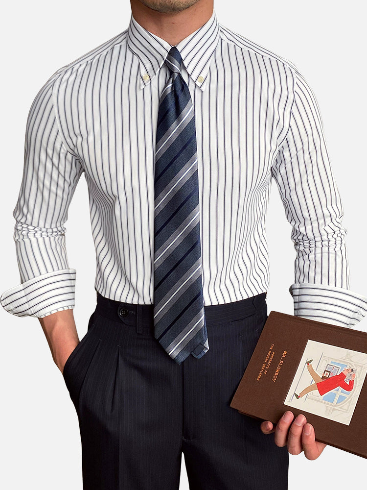 細いストライプ柄がシンプルで洗練された印象を与え、スリムなシルエットを際立たせます。イタリアンカットと程よいウエストシェイプが逆三角形のラインを自然に引き立て、すっきりとした佇まいに。尖った襟に固定ボタンを配し、ノーネクタイでも美しいラインをキープ。2つボタンのアール型袖口がイタリアンクラシックな雰囲気を添えます。