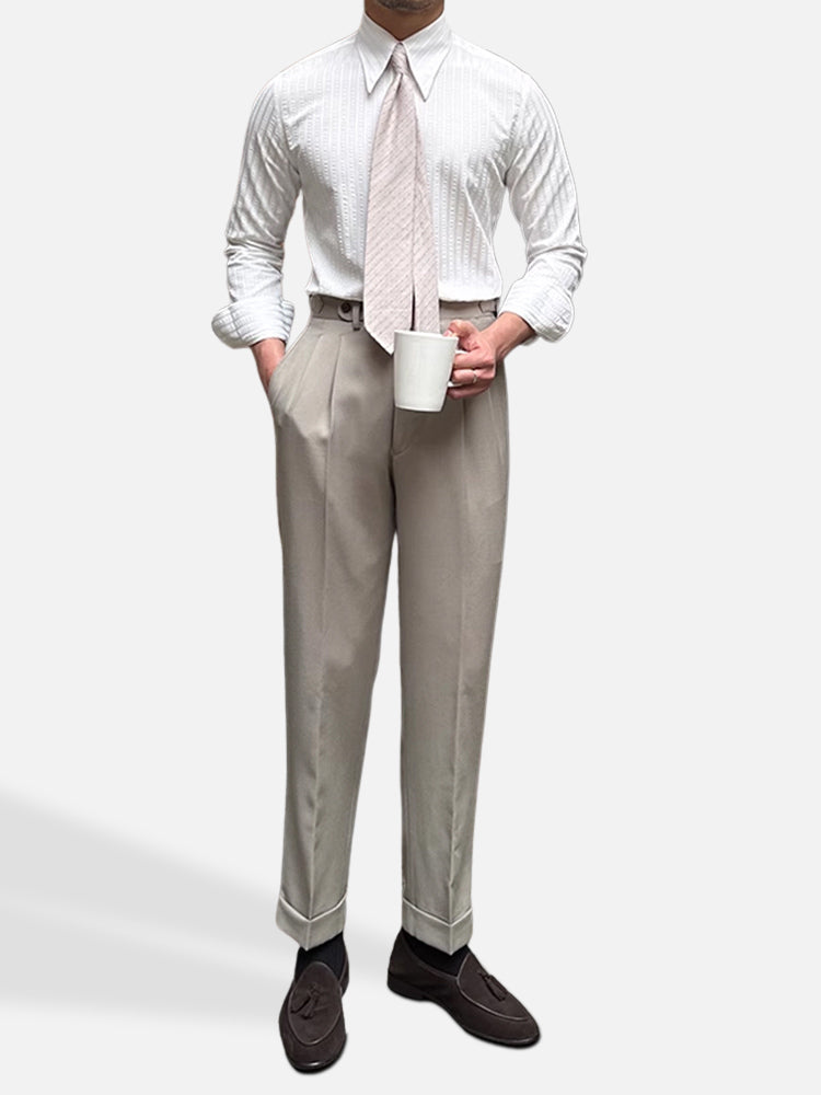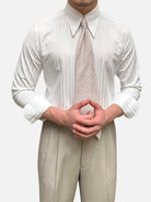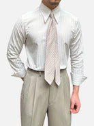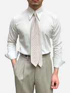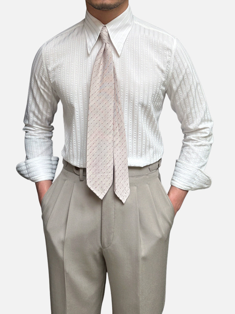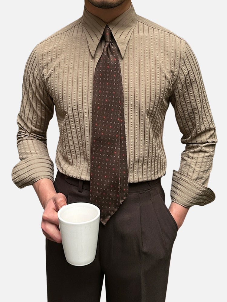 イタリアンテイストの大ぶりなスプレッドカラーがシャープで流れるようなラインを描き、軽やかでエレガントな印象に。落ち感のあるストレートシルエットは体型を選ばず、快適でリラックスした着心地です。控えめなストライプ柄が視覚的なアクセントとなり、都会の日常からリゾートまで幅広く活躍します。
