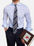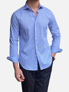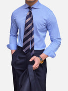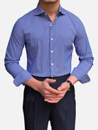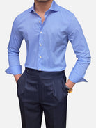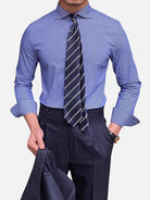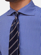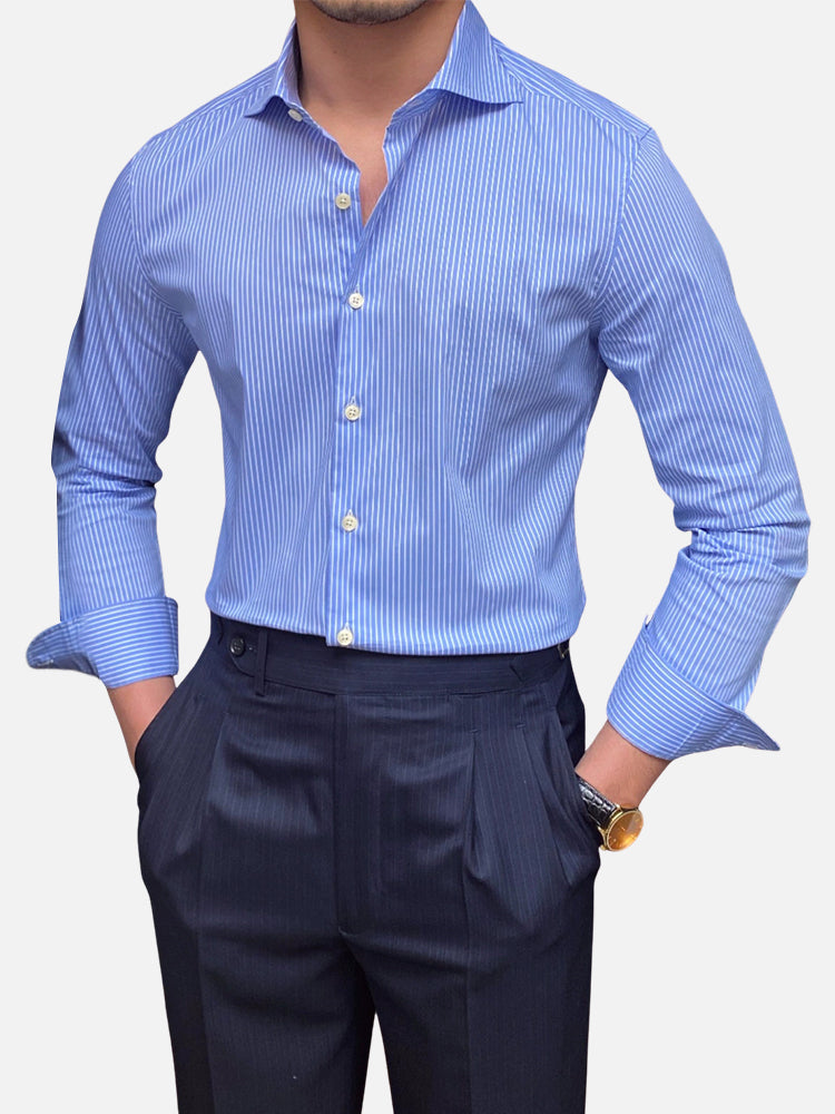 温莎カラーが自然な広がりで顔まわりを引き立て、優雅かつシャープな印象に。スリムフィットのストレートシルエットがすっきりとしたラインを描き、ストライプ柄が奥行きをプラス。さまざまな体型やシーンに対応します。