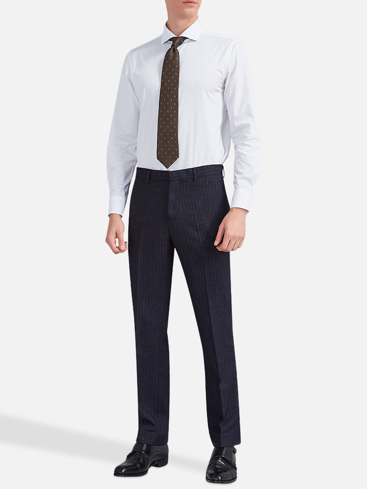 白シャツとダークグレーやネイビーのジャケットで端正なビジネススタイルに。タートルネックニットとローファーで、上品なカジュアルにも対応。